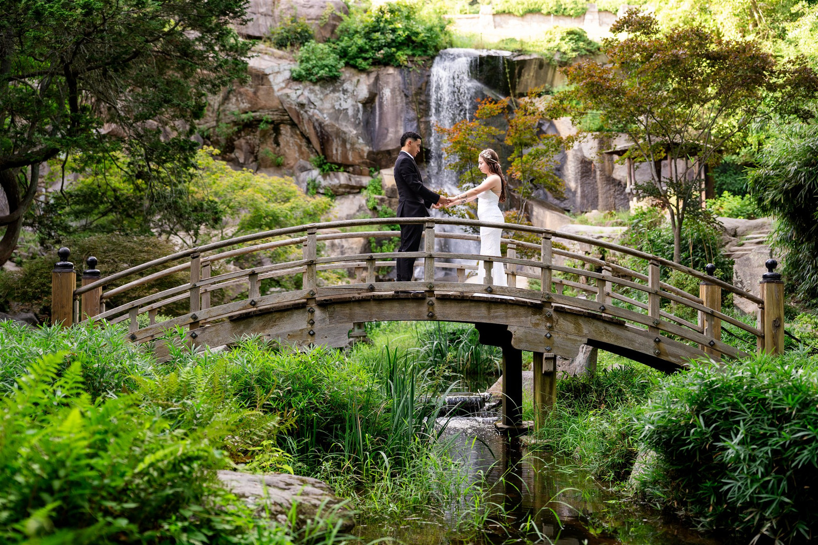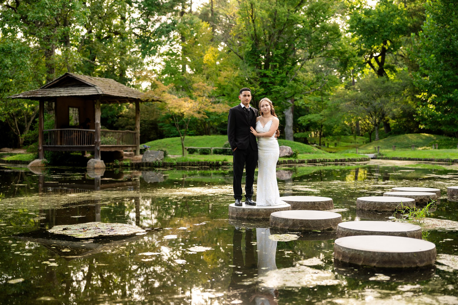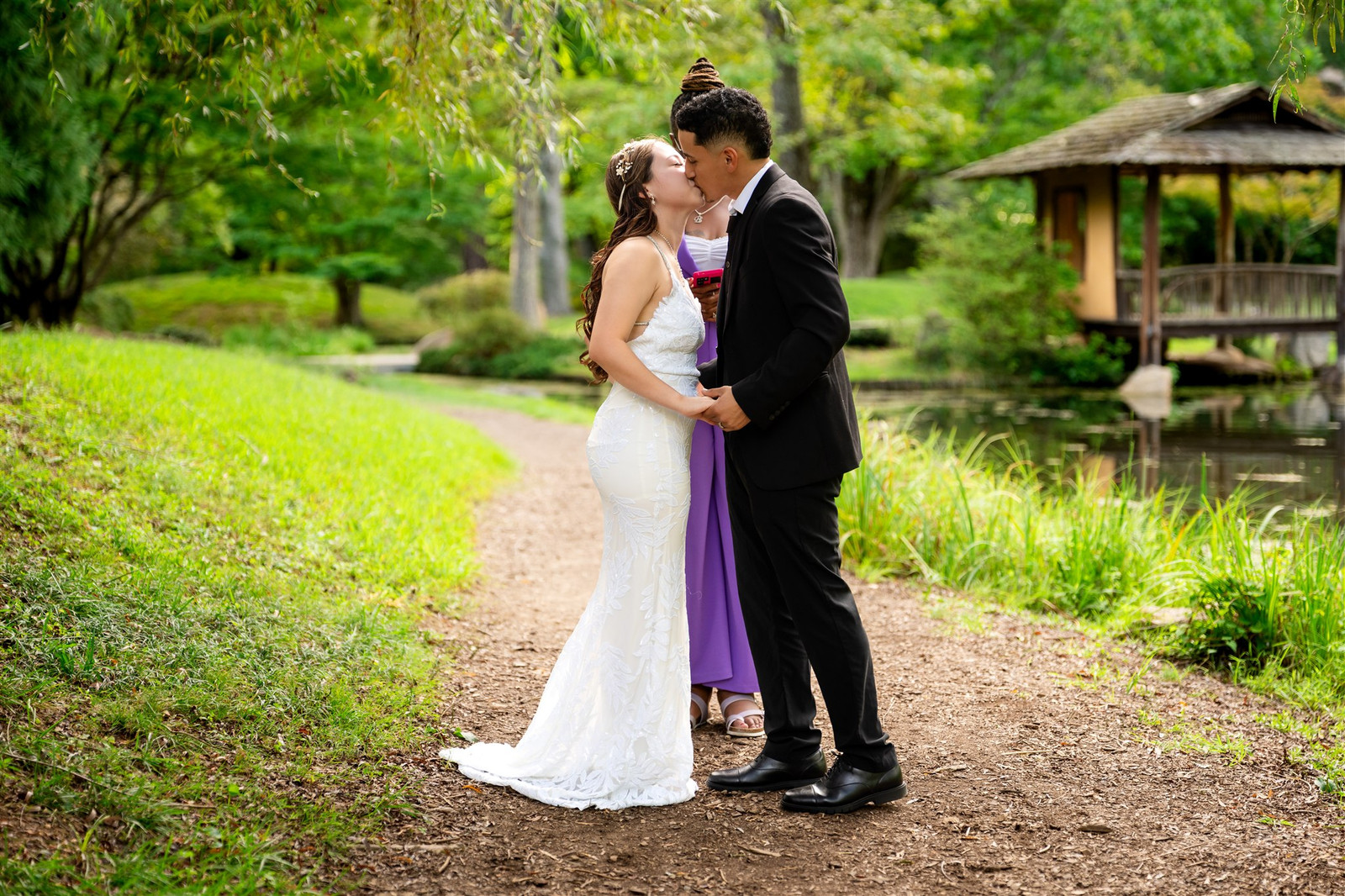 The Japanese Garden is known for its magnificent waterfall — and it really is. But if you held a ceremony there, you’d have an audience. They chose a quieter path overlooking a pond, where they could share vows without distraction.