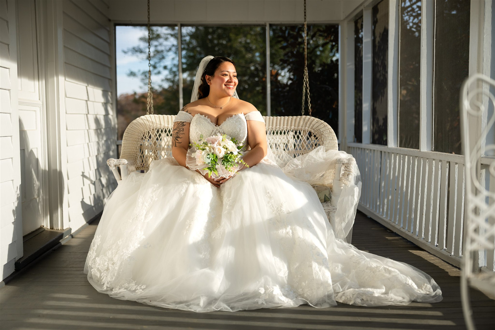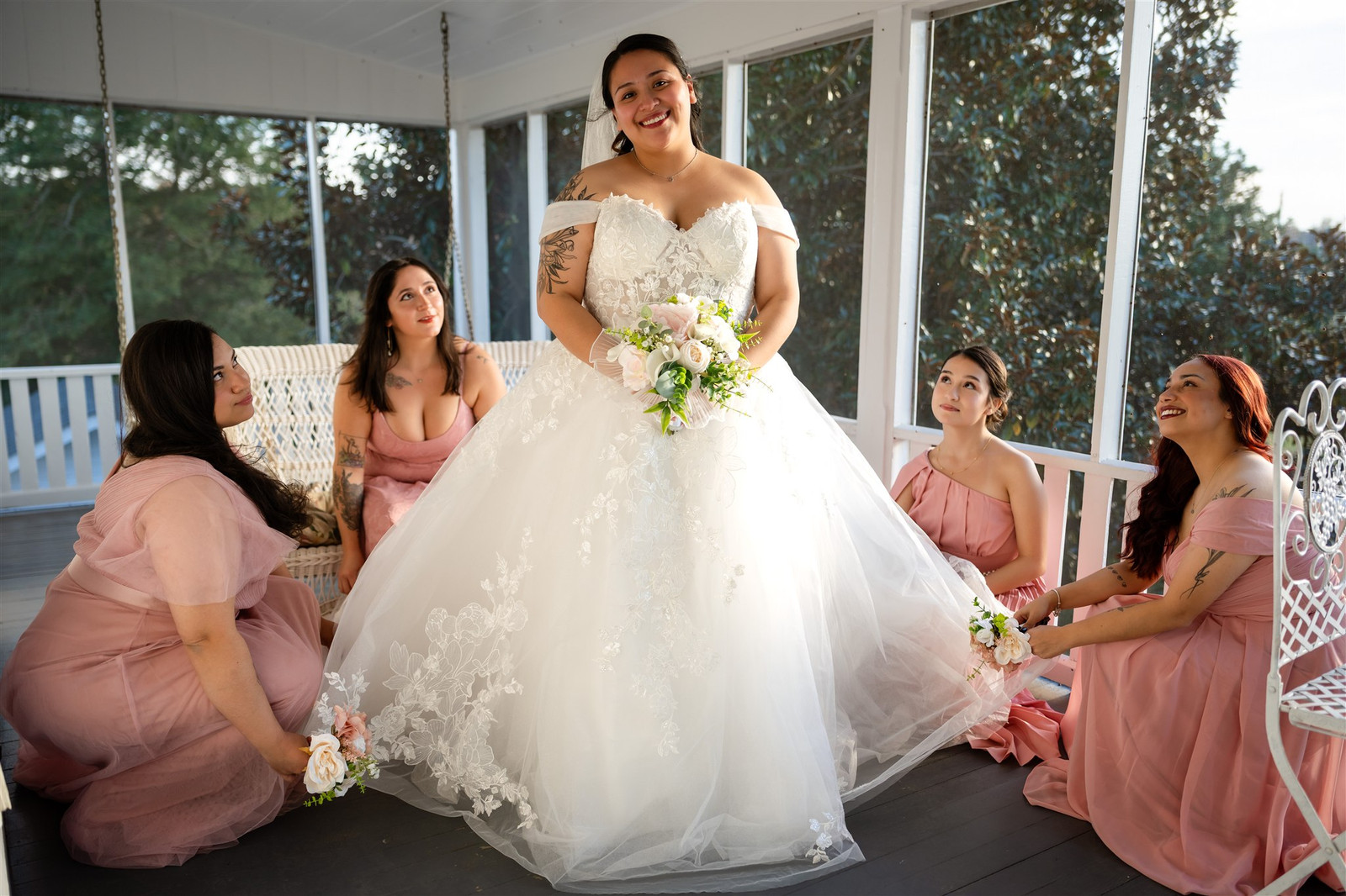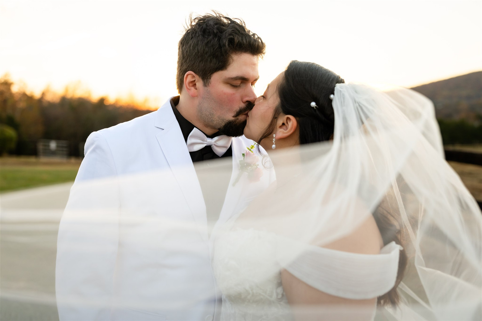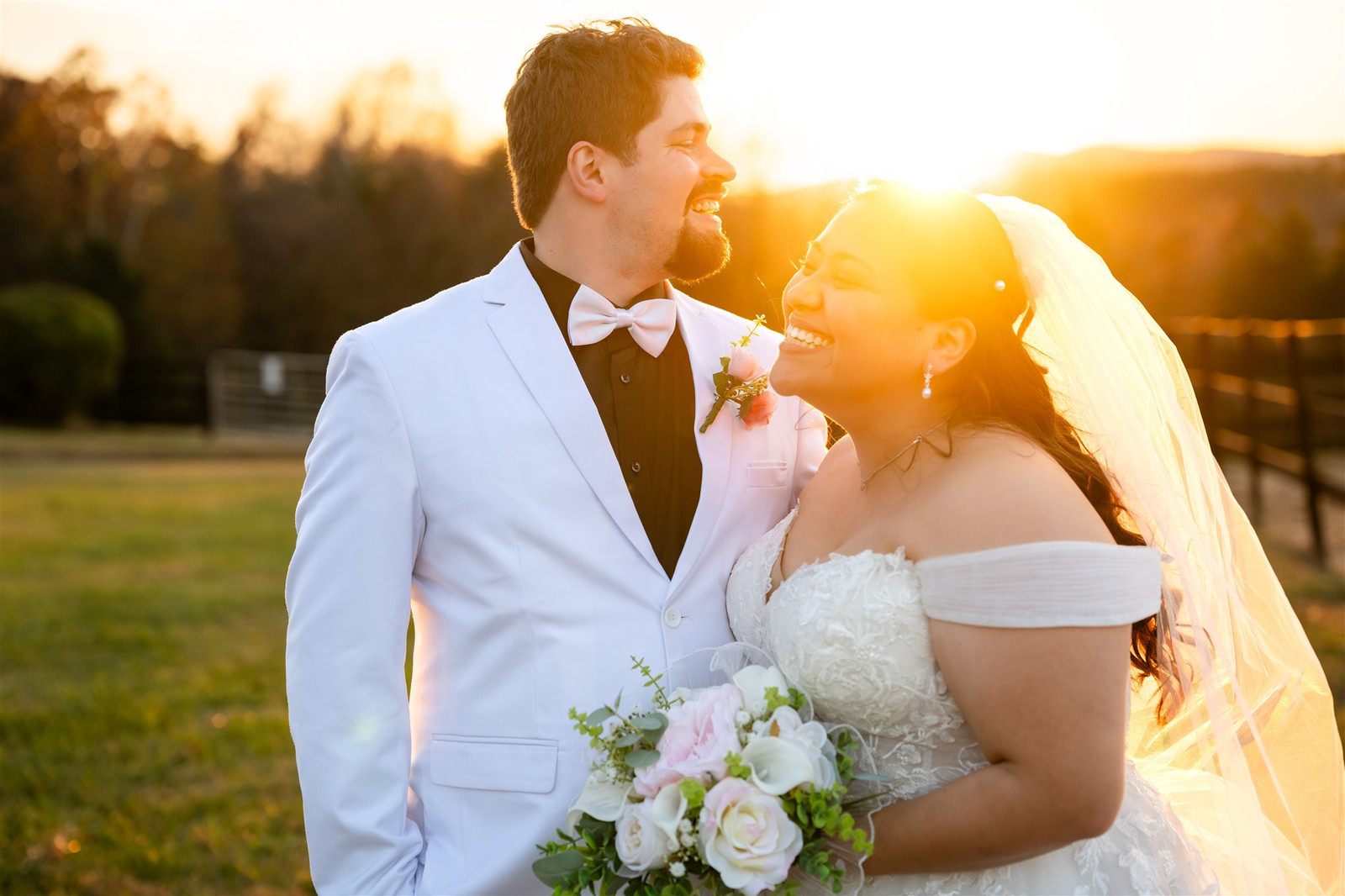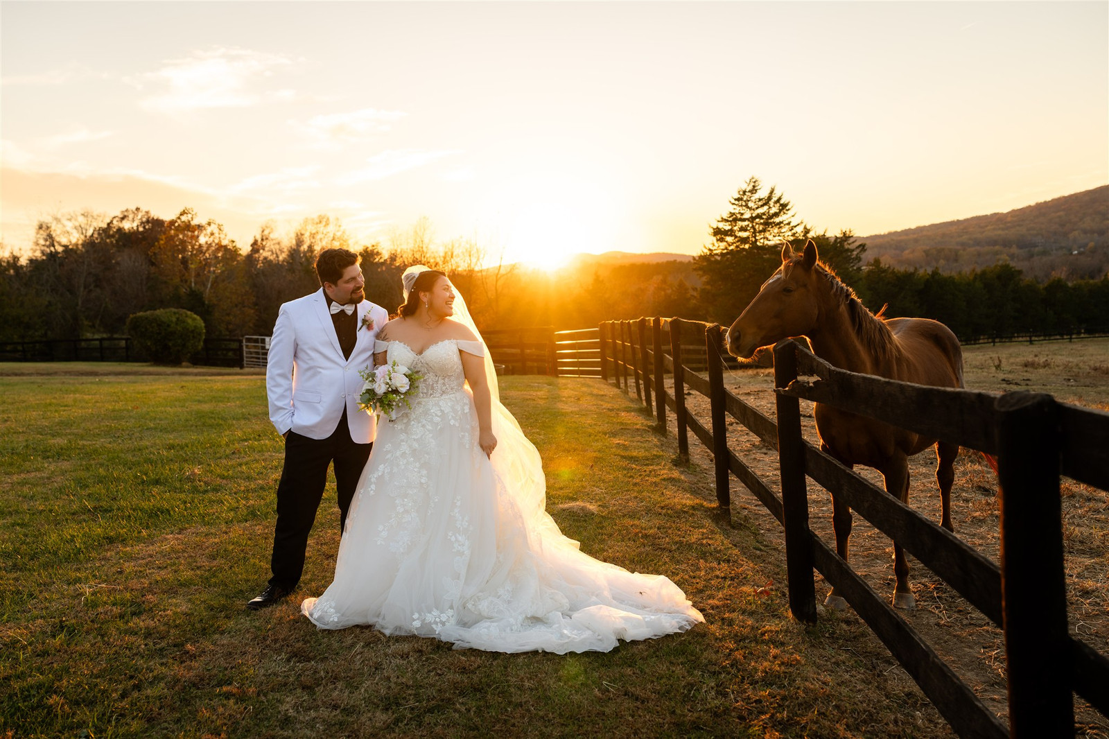 We started with portraits beneath the trees and ended with a sunset session in the field. During our golden hour shoot, one of the horses came to the edge of the pasture and watched us quietly. Guests aren’t allowed to pet or feed the horses at Wolftrap Farm, but the timing and the backlighting were perfect. It added a bit of quiet magic to the portraits.